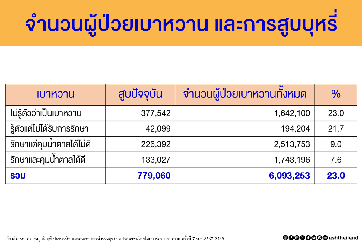 เมื่อวันที่ 25 พ.ย. 2568 รศ.พญ.เริงฤดี ปธานวนิช คณะแพทยศาสตร์รามาธิบดี กล่าวว่า ข้อมูลจากการสำรวจสุขภาพประชากรไทยโดยการตรวจร่างกายครั้งที่ 7 พ.ศ. 2567-2568 จัดทำโดยคณะแพทยศาสตร์โรงพยาบาลรามาธิบดี ร่วมกับ กระทรวงสาธารณสุข (สธ.) สถาบันวิจัยระบบสาธารณสุข (สวรส.) และสำนักงานกองทุนสนับสนุนการสร้างเสริมสุขภาพ (สสส.) พบว่ามีคนไทยเป็นเบาหวาน 6.1 ล้านคน ในจำนวนนี้ เป็นคนที่สูบบุหรี่ 779,060 คน และมี 377,542 คน หรือครึ่งหนึ่งที่ไม่รู้ว่าตัวเองเป็นเบาหวาน ขณะที่มีผู้ที่รู้ว่าป่วยเบาหวานแต่ไม่ได้รับการรักษา 42,099 คน โดยผู้ป่วยเบาหวานที่เข้ารับการรักษาแต่คุมเบาหวานได้ไม่ดี 226,392 คน และมีผู้ป่วยเบาวหวานที่รับการรักษาและสามารถคุมเบาหวานได้ดีเพียง 133,027 คนเท่านั้น