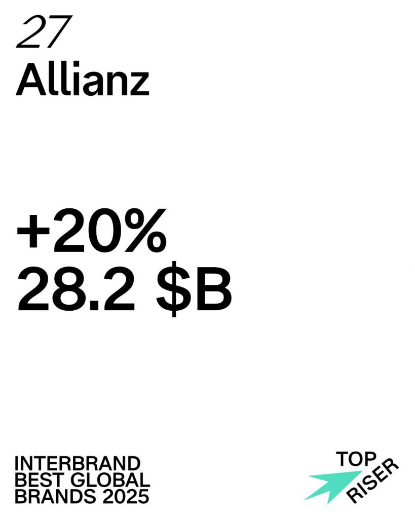 อลิอันซ์ ผู้นำด้านประกันภัยและการบริหารสินทรัพย์ระดับโลก ได้รับการจัดอันดับให้เป็น บริษัทประกันภัยอันดับ 1 ของโลก ต่อเนื่องเป็นปีที่ 7 จากการจัดอันดับ “Best Global Brands 2568” โดยบริษัทที่ปรึกษาชั้นนำ Interbrand โดยในปีนี้ อลิอันซ์ได้ขยับขึ้นมาอีก 2 อันดับ อยู่ที่อันดับ 27 จากแบรนด์องค์กรทั้งหมดทั่วโลก โดย 5 อันดับแรก ได้แก่ Apple, Microsoft, Amazon, Google และ Samsung