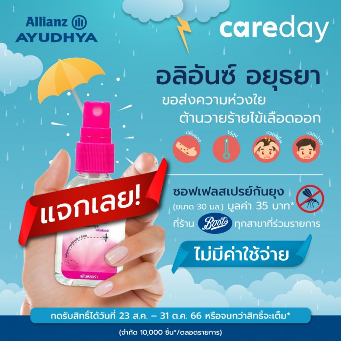 แคมเปญ Care Day 2023 นี้ มอบสิทธิพิเศษให้กับลูกค้าอลิอันซ์ อยุธยา แจกฟรี ซอฟเฟล สเปรย์กันยุง(30ML) 10,000 ชิ้น แทนความห่วงใยมอบให้แก่ลูกค้าในช่วงฤดูฝนที่โรคไข้เลือดออกกำลังระบาด โดยลูกค้าสามารถกดรับสิทธิ์สเปรย์กันยุง ฟรี! ผ่านแอพพลิเคชั่น My Allianz และ Healthy Living สำหรับลูกค้าประกันภัย รับสิทธิ์ผ่าน http://www.azay.co.th กรอกข้อมูลออนไลน์ ตั้งแต่วันนี้จนถึง 31 ตุลาคม 2566 หลังยืนยันข้อมูลจะได้รับสิทธิ์ผ่านทาง SMS ส่งไปที่เบอร์ที่ลงทะเบียนไว้ ภายใน 3 วันทำการหลังการลงทะเบียน แลกรับของได้ที่ร้าน Boots ทุกสาขาที่ร่วมรายการ ตั้งแต่วันนี้ถึง 31 ตุลาคม 2566 หรือจนกว่าของจะหมด