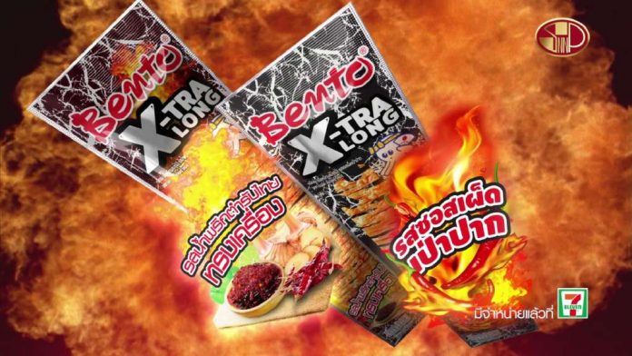 เบนโตะ เอ็กซ์ตร้าลอง เนื้อหมึกบดแผ่นยาวต่อเนื่องไม่มีสะดุด พร้อมจุดฉีกซอง 2 ระยะ เพื่อความอร่อยง่ายไม่ขาดตอน มาพร้อมผลิตภัณฑ์ 2 รสชาติใหม่ ที่สุดของความจัดจ้าน 2 แบบ 2 สไตล์ กับ น้ำพริกตำรับไทยทรงเครื่อง เนื้อหมึกบดราดด้วยซอสแบบถึงเครื่องถึงรสสไตล์ไทย และ ซอสเผ็ดเป่าปาก เนื้อหมึกบดราดด้วยซอสแซ่บซี๊ด สองรสชาติความอร่อยกับซอสรสเข้มข้นที่เผ็ดลึกเข้าถึงเนื้อหมึกบด ช่วยให้ลิ้มรสความอร่อยเด็ด เผ็ด มันส์ แบบอันลิมิต พบกับ เบนโตะ เอ็กซ์ตร้าลอง ทั้ง 2 รสชาติ ได้ที่ 7-11 ทุกสาขา ตั้งแต่วันที่ 2 ธันวาคมนี้