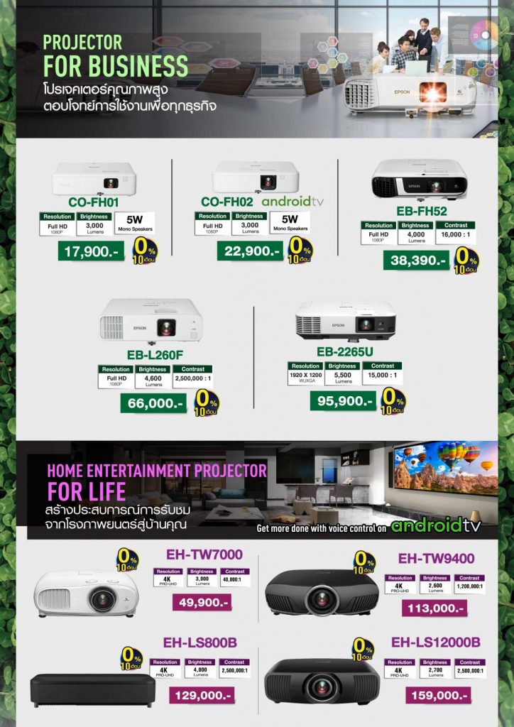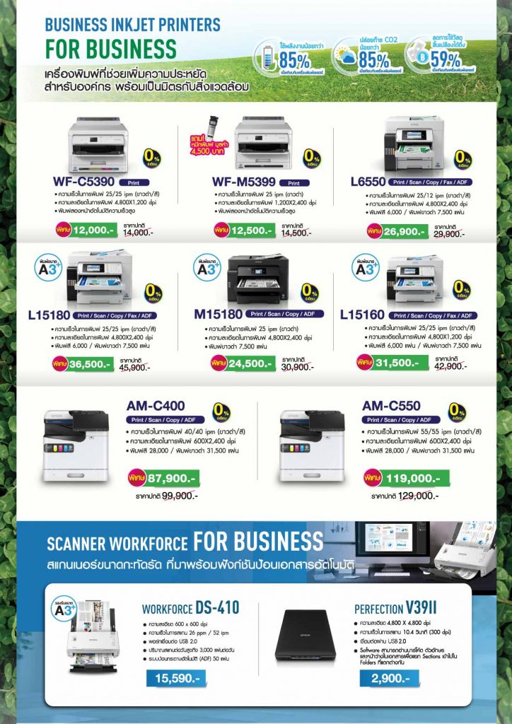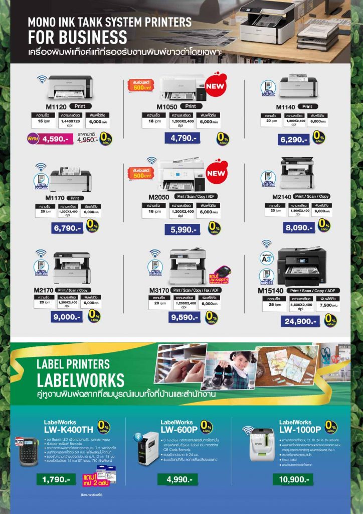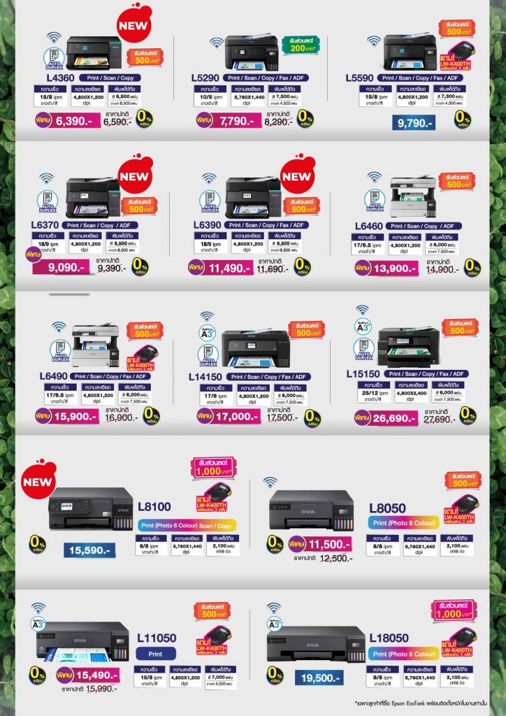 ไฮไลต์สินค้าลดหนักในงาน กลุ่มเครื่องพิมพ์เพื่อสำนักงาน ลดสูงสุดกว่า 12,000 บาท อาทิ เครื่องพิมพ์มัลติฟังก์ชัน AM-C550 (Print/Scan/Copy/ADF) ราคาพิเศษ 119,000 บาท (ปกติ 129,000 บาท) ความเร็วพิมพ์สี 55 ipm ความละเอียด 600×2,400 dpi เหมาะสำหรับองค์กรที่ต้องการประสิทธิภาพสูง เครื่องพิมพ์มัลติฟังก์ชันขนาด A3 (Print/Scan/Copy/ADF) รุ่น L15180 ราคาพิเศษ 36,500 บาท (ปกติ 45,900 บาท) เป็นต้น พิเศษ! เอปสันมอบความคุ้มค่ายิ่งขึ้นด้วยแคมเปญ “เก่าแลกใหม่” เพียงนำเครื่องพิมพ์เก่ารุ่นใด ยี่ห้อใดก็ได้ มาแลกซื้อ EcoTank เครื่องใหม่ รับส่วนลดทันทีสูงสุด 1,000 บาท สามารถเลือกอัปเกรดตามสไตล์การใช้งาน ได้แก่ มัลติฟังก์ชันสำหรับบ้านและสำนักงาน รับส่วนลด 500 บาท ได้แก่รุ่น L3210,L3250, L3550เครื่องพิมพ์ขาวดำประหยัดต้นทุน รับส่วนลด 700 บาท ได้แก่ M1120,,M1050, M1140, M1170, M2050, M2140, M2170 และ M154 หรือรุ่นสำหรับธุรกิจ SME รับส่วนลดสูงสุด 1,000 บาท ได้แก่ L4360 / M3170