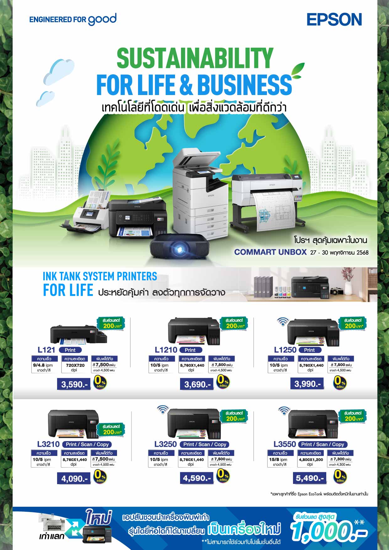 นอกจากความคุ้มค่าในการอัปเกรด ผู้ใช้ยังร่วมช่วยลดปริมาณขยะอิเล็กทรอนิกส์ (e-waste) เพราะเอปสันจะนำเครื่องพิมพ์ที่รับคืนไปกำจัดอย่างถูกวิธี ห้ามพลาด! พบกับโปรโมชั่นสุดคุ้มเฉพาะในงาน COMMART UNBOX วันนี้ ถึงวันที่ 30 พฤศจิกายนนี้ 10.00 – 21.00 น. ณ บูธ B8 ฮอลล์ EH98-99 ศูนย์นิทรรศการและการประชุมไบเทค สอบถามข้อมูลเพิ่มเติม โทร. 0-2460-9699 หรือเยี่ยมชมเว็บไซต์ www.epson.co.th,
