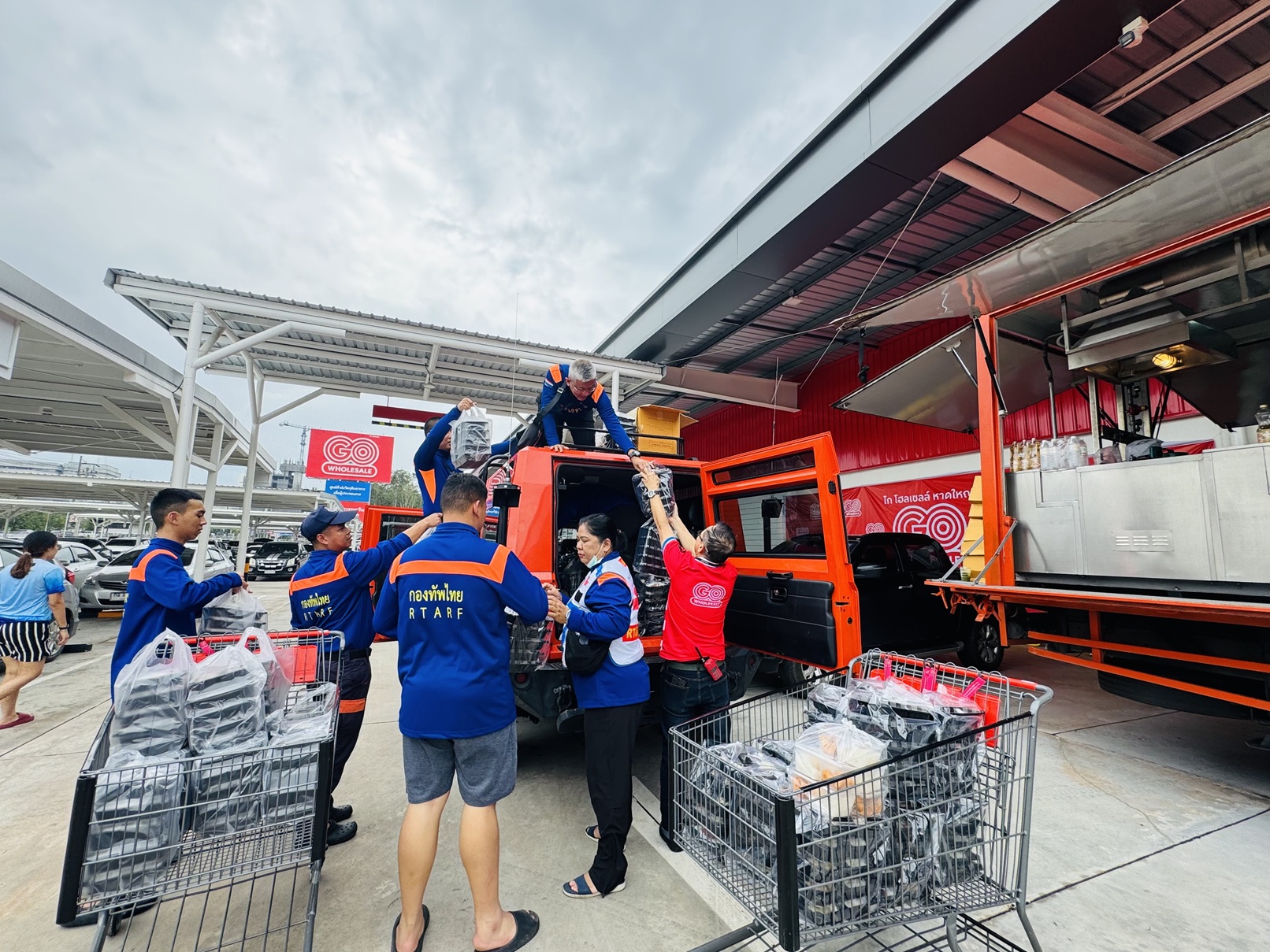 ล่าสุด เปิดพื้นที่ให้ “รถครัวสนาม” จากกองบัญชาการกองทัพไทย โดยศูนย์บรรเทาสาธารณภัย สำนักงานสนับสนุน หน่วยบัญชาการทหารพัฒนา (ศบภ.สสน.นทพ.) ปักหลักเป็นครัวกลางประกอบการอาหารปรุงสุกทุกวัน วันละมากกว่า 1,000 กล่อง เพื่อนำไปแจกจ่ายให้แก่เจ้าหน้าที่ทหารและผู้ประสบภัย โดย โก โฮลเซลล์ ได้ร่วมบริจาควัตถุดิบคุณภาพ ทั้งอาหารสด อาหารแห้ง เครื่องปรุงต่างๆ จากแบรนด์ A-Choice ให้ครัวสนามได้นำไปใช้ประกอบอาหาร จากนั้นทีมทหารจะนำขึ้นรถ ไปส่งมอบให้ถึงมือพี่น้องประชาชนที่ได้รับความเดือดร้อนในพื้นที่ต่างๆ