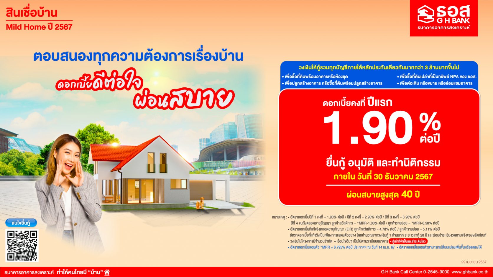 มีบ้านเป็นของตนเองง่ายขึ้น จัดทำสินเชื่อ Mild Home ปี 2567 กรอบวงเงิน 10,000 ล้านบาท สำหรับที่อยู่อาศัยในระดับราคามากกว่า 3 ล้านบาทขึ้นไป อัตราดอกเบี้ยปีแรกเพียง 1.90% ต่อปี เฉลี่ย 3 ปีแรก 2.90% ต่อปี ระยะเวลากู้นานสูงสุด 40 ปี เงินงวดปีแรกเพียงล้านละ 2,500 บาทเท่านั้น! ผู้ที่สนใจสามารถยื่นคำขอกู้ได้ตั้งแต่วันนี้ และทำนิติกรรมภายในวันที่ 30 ธันวาคม 2567 ณ สาขาธนาคารทั่วประเทศ