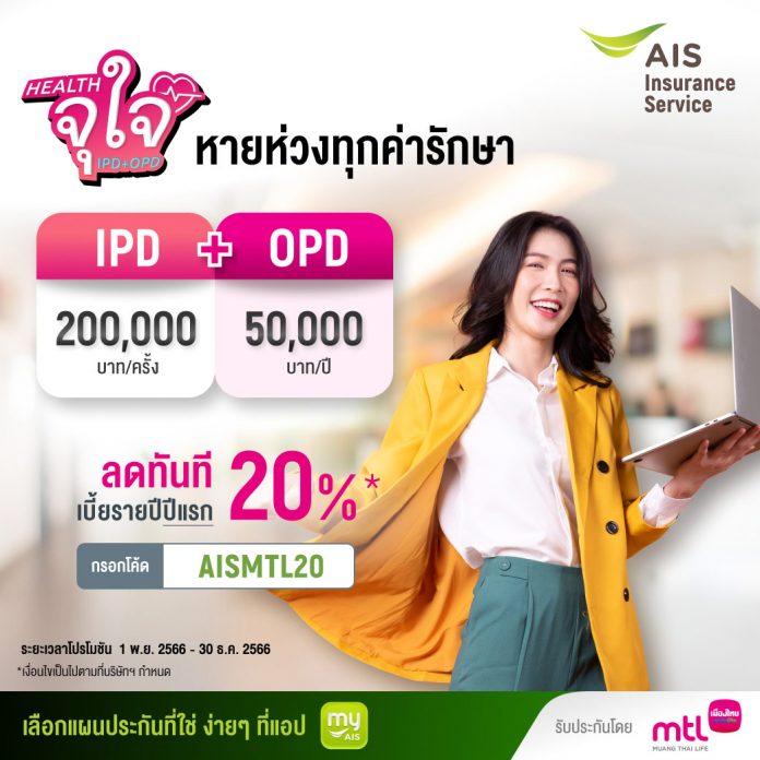 เมืองไทยประกันชีวิต จับมือ AIS มอบความสุขส่งท้ายปีแก่ลูกค้า AIS Serenade ส่ง โครงการ “Health จุใจ IPD+OPD” ช่วยเพิ่มความอุ่นใจ หายห่วงเรื่องค่ารักษา เปิดประสบการณ์ใหม่ประกันสุขภาพออนไลน์ และสิทธิพิเศษโดนใจ เพียงกรอกโค้ด “AISMTL20” พร้อมรับความสุขและความอุ่นใจ ได้แล้วตั้งแต่ 1 พ.ย. – 30 ธ.ค. 2566