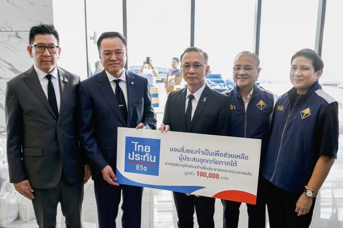 บริษัท ไทยประกันชีวิต จำกัด (มหาชน) มอบสิ่งของจำเป็นเพื่อช่วยเหลือผู้ประสบอุทกภัย ภายใต้โครงการ “ธารน้ำใจ ช่วยผู้ประสบอุทกภัยภาคใต้” ผ่านศูนย์อำนวยการช่วยเหลือเครือข่ายวายุภักษ์ กระทรวงการคลัง โดยมีนายอนุทิน ชาญวีรกูล นายกรัฐมนตรีและรัฐมนตรีว่าการกระทรวงมหาดไทย และ ดร.เอกนิติ นิติทัณฑ์ประภาศ รองนายกรัฐมนตรีและรัฐมนตรีว่าการกระทรวงการคลัง เป็นผู้รับมอบ พร้อมนี้ นายชูฉัตร ประมูลผล เลขาธิการ และนางสาววสุมดี วสีนนท์ รองเลขาธิการ ด้านกำกับคนกลางและประกันภัยภูมิภาค สำนักงานคณะกรรมการกำกับและส่งเสริมการประกอบธุรกิจประกันภัย (คปภ.) ร่วมรับมอบในฐานะหน่วยงานกำกับดูแลที่ส่งเสริมให้ภาคธุรกิจประกันภัย รวมน้ำใจส่งมอบความห่วงใยสู่ผู้ประสบอุทกภัยภาคใต้ ณ บริเวณชั้น 1 อาคาร 150 ปี กระทรวงการคลัง