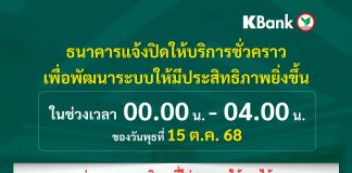 กสิกรไทยแจ้งปิดให้บริการชั่วคราว เป็นเวลา 4 ชั่วโมง ช่วง 00.00-04.00 น. ของ 15 ต.ค. 68