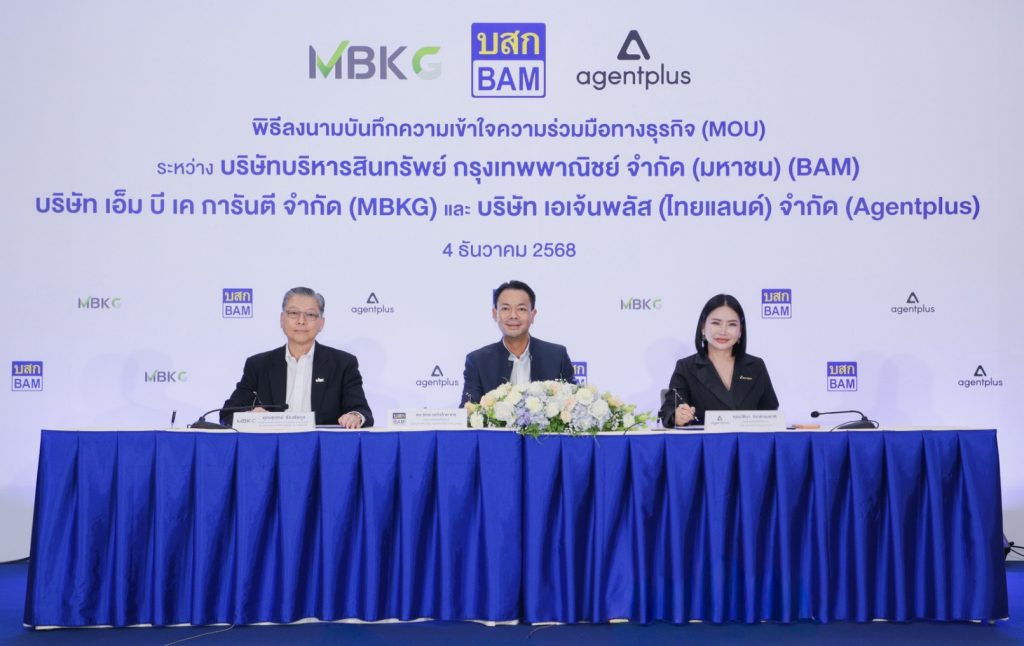วันนี้ (4 ธ.ค. 68) บริษัทบริหารสินทรัพย์ กรุงเทพพาณิชย์ จำกัด (มหาชน) (BAM) ได้ลงนามบันทึกข้อตกลงความร่วมมือทางธุรกิจ (MOU) บริษัท เอ็ม บี เค การันตี จำกัด (MBKG) กับ บริษัท เอเจ้นพลัส (ไทยแลนด์) จำกัด (Agentplus) และ เพื่อลดระยะเวลาในการถือครองทรัพย์ และเร่งการสร้างรายได้ รวมทั้งเพิ่มช่องทางการให้บริการลูกค้า เพื่อให้เกิดการเติบโตทางธุรกิจอย่างยั่งยืน
