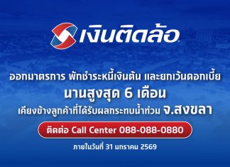 “เงินติดล้อ” ออกมาตรการพักชำระหนี้เงินต้น และยกเว้นดอกเบี้ย นานสูงสุด 6 เดือน เพื่อแบ่งเบาภาระการเงิน เคียงข้างลูกค้า จ.สงขลา ฟื้นฟูความเป็นอยู่หลังน้ำท่วม