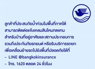 กรุงเทพประกันภัยแจ้งปิดทำการสาขาหาดใหญ่ชั่วคราวจนกว่าสถานการณ์จะคลี่คลาย พร้อมเป็นกำลังใจให้แก่ผู้ประสบภัยน้ำท่วมในภาคใต้