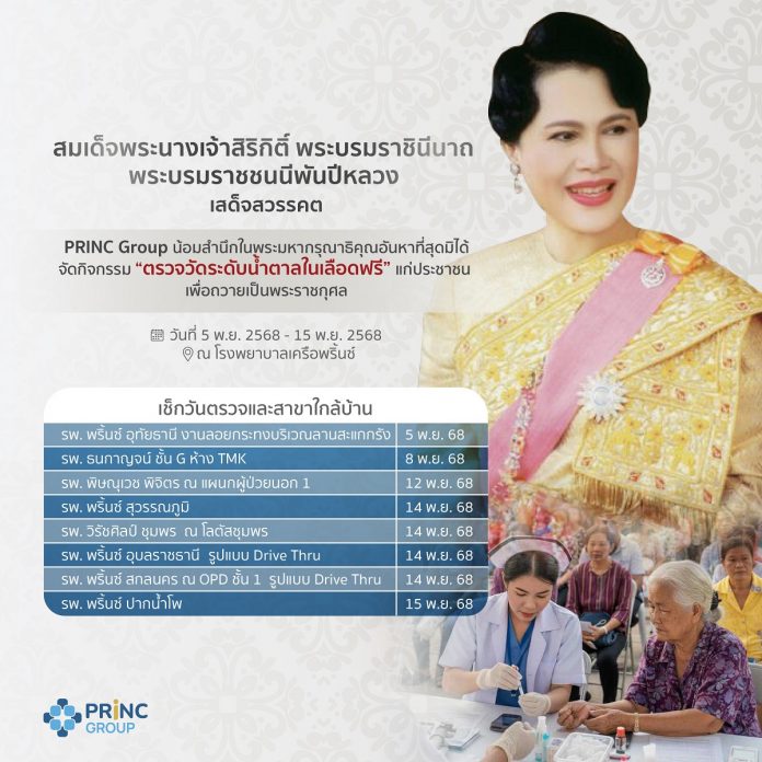ตามที่สำนักพระราชวังได้ประกาศว่า สมเด็จพระนางเจ้าสิริกิติ์ พระบรมราชินีนาถ พระบรมราชชนนี พันปีหลวง เสด็จสวรรคต เมื่อวันที่ 24 ตุลาคม 2568 บริษัท พริ้นซิเพิล แคปิตอล จำกัด (มหาชน) หรือ PRINC Group และโรงพยาบาลในเครือทั่วประเทศ น้อมสำนึกในพระมหากรุณาธิคุณและในพระเมตตาอันหาที่สุดมิได้ จึงร่วมกันจัดกิจกรรมสาธารณประโยชน์ “ตรวจคัดกรองเบาหวานฟรี” (เจาะน้ำตาลปลายนิ้ว) เพื่อถวายเป็นพระราชกุศลแด่ สมเด็จพระบรมราชชนนีพันปีหลวง โดยเปิดให้บริการตรวจวัดระดับน้ำตาลในเลือดแก่ประชาชนโดยไม่เสียค่าใช้จ่าย ระหว่างวันที่ 5–15 พฤศจิกายน 2568 ณ โรงพยาบาลในเครือพริ้นซ์ 8 แห่ง