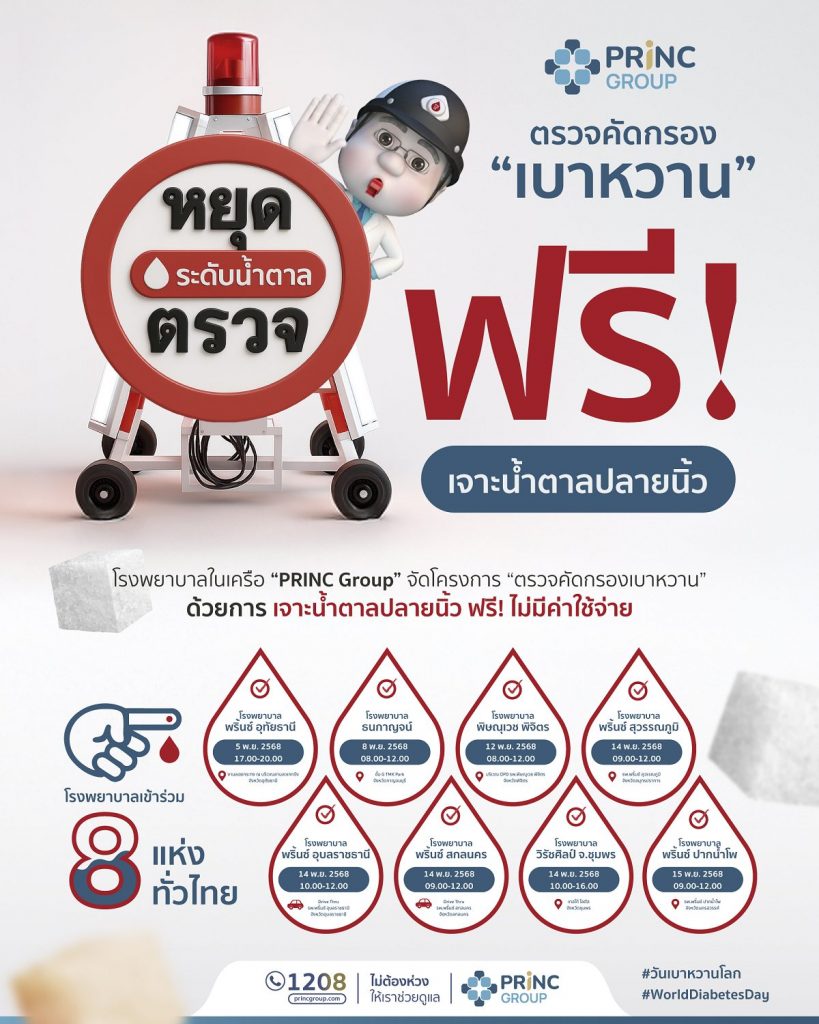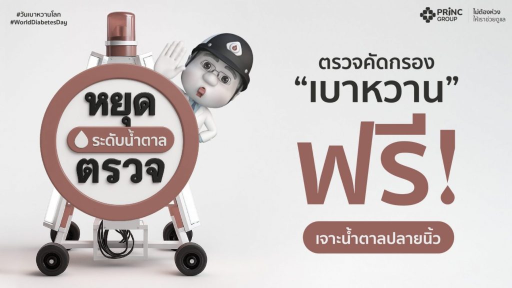 PRINC Group ขอเชิญชวนประชาชนผู้สนใจเข้ารับบริการ ‘ตรวจคัดกรองเบาหวานฟรี’ สอบถามข้อมูลเพิ่มเติมได้ที่โรงพยาบาลเครือพริ้นซ์ใกล้บ้านท่าน หรือติด ตามข้อมูลข่าวสารได้ทางเว็บไซต์ www.princgroup.com