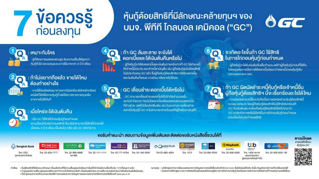 ท่ามกลางภาวะเศรษฐกิจโลกที่ยังคงมีความไม่แน่นอน และแนวโน้มอัตราดอกเบี้ยที่เริ่มปรับลดลงตั้งแต่ต้นปีที่ผ่านมา GC เชื่อว่าหุ้นกู้ด้อยสิทธิที่มีลักษณะคล้ายทุนฯ ของบริษัทฯ จะเป็นอีกทางเลือกการลงทุนสำหรับผู้ที่ต้องการผลตอบแทนระยะยาวที่ชัดเจน โดยให้ผลตอบแทนสูงกว่าเงินฝากและหุ้นกู้ทั่วไป การออกหุ้นกู้ด้อยสิทธิที่มีลักษณะคล้ายทุนฯ ในครั้งนี้ ยังเป็นส่วนหนึ่งของกลยุทธ์ที่สำคัญของ GC เพื่อเสริมสร้างความแข็งแกร่งของโครงสร้างเงินทุน รองรับการเติบโตอย่างยั่งยืน และต่อยอดการพัฒนาธุรกิจมูลค่าสูง–คาร์บอนต่ำ (High Value–Low Carbon) ตอกย้ำบทบาทของ GC ในฐานะผู้นำในธุรกิจเคมีภัณฑ์ระดับโลก นอกจากนั้น GC มีความประสงค์ที่จะมอบหุ้นกู้ด้อยสิทธิที่มีลักษณะคล้ายทุนฯ รุ่นนี้ให้เป็นของขวัญปีใหม่แก่นักลงทุนทั่วไป