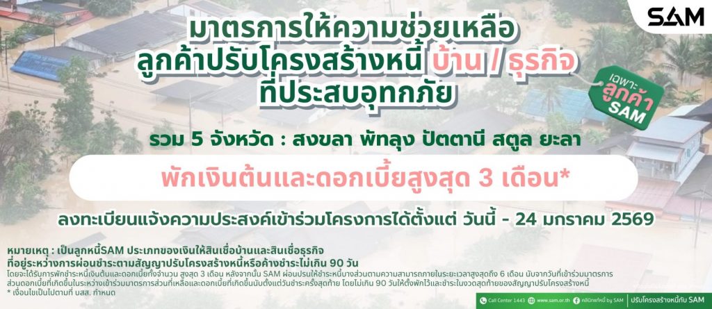 SAM ออกมาตรการพักชำระเงินต้น-ลดดอกเบี้ยสูงสุด 3 เดือน ช่วยเหลือลูกค้าผู้ประสบภัยน้ำท่วมใน 5 จังหวัดทางภาคใต้ เพื่อบรรเทาความเดือดร้อน