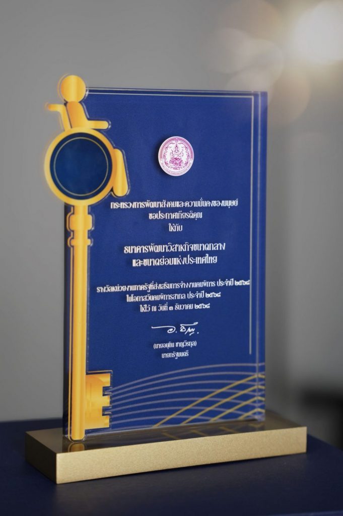 ธนาคารพัฒนาวิสาหกิจขนาดกลางและขนาดย่อมแห่งประเทศไทย (ธพว.) หรือ SME D Bank โดยนายเขมชาติ อภิรัชตานนท์ รองกรรมการผู้จัดการ เป็นตัวแทนรับมอบโล่ประกาศเกียรติคุณ รางวัลหน่วยงานภาครัฐส่งเสริมการจ้างงานคนพิการ ในงานวันคนพิการสากล ประจำปี 2568 จัดโดยกรมส่งเสริมและพัฒนาคุณภาพชีวิตคนพิการ กระทรวงการพัฒนาสังคมและความมั่นคงของมนุษย์