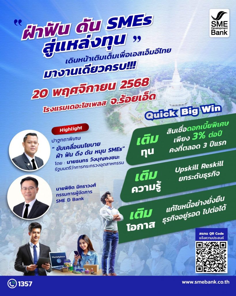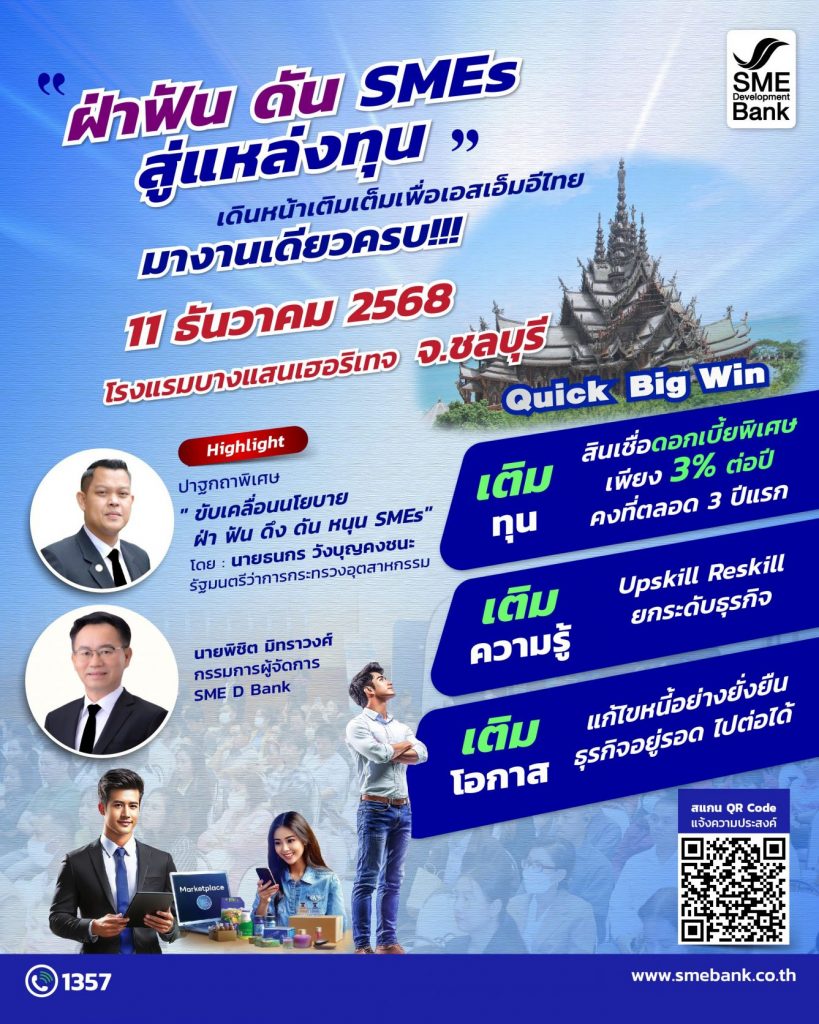 ธนาคารพัฒนาวิสาหกิจขนาดกลางและขนาดย่อมแห่งประเทศไทย (ธพว.) หรือ SME D Bank เดินหน้าเต็มกำลังขับเคลื่อนนโยบาย “Quick Big Win” ของรัฐบาล สนับสนุนผู้ประกอบการเอสเอ็มอี เดินหน้าคว้าโอกาสธุรกิจเติบโตช่วงโค้งสุดท้ายปี 2568 จัดกิจกรรม “ฝ่าฟัน ดัน SMEs สู่แหล่งทุน” มอบบริการ “3 เติม” ช่วยธุรกิจครบถ้วนในจุดเดียว ได้แก่ 1.“เติมทุน” เข้าถึงสินเชื่ออัตราดอกเบี้ยพิเศษเพียง 3% ต่อปี คงที่ตลอด 3 ปีแรก ผ่อนชำระนานสูงสุด 10 ปี วงเงินกู้สูงสุด 15 ล้านบาท ยื่นกู้ได้ทันทีในงาน 2. “เติมความรู้” ยกระดับกิจการ พัฒนาธุรกิจ Upskill Reskill ด้วยแพลตฟอร์ม DX by SME D Bank (dx.smebank.co.th) สะดวกสบาย ใช้บริการได้ตลอด 24 ชม. และ 3.“เติมโอกาสแก้ไขหนี้อย่างยั่งยืน” ด้วยมาตรการ “3 ลด ปลดหนี้” ช่วยลดภาระการเงิน สร้างโอกาสพลิกฟื้นกิจการ
