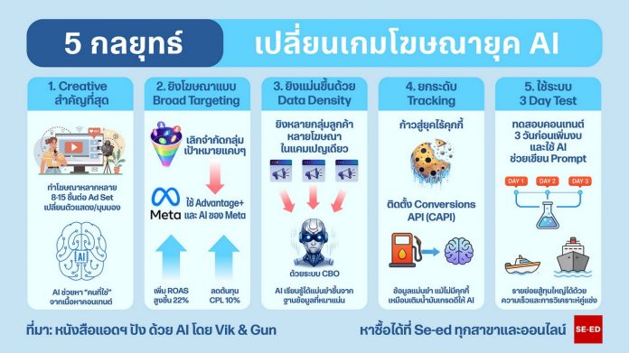 จากการรวบรวมประสบการณ์ตรงของคุณวิค – อัครวัฒน์ และคุณกัน – ชวพล ทั้งสองได้ถ่ายทอดลายแทงทางรอดผ่านหนังสือคู่มือการตลาด “แอดฯ ปังด้วย AI เปลี่ยนงบหลักร้อยเป็นเงินล้าน” โดยสรุป 5 กลยุทธ์ที่ต้องปรับใช้ทันที ดังนี้