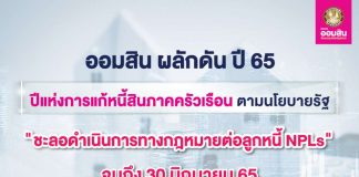 ออมสิน ผลักดัน ปี 65 ปีแห่งการแก้หนี้สินภาคครัวเรือน วาระแห่งชาติตามนโยบายรัฐ ประกาศชะลอดำเนินการทางกฎหมายไม่ฟ้องร้องลูกหนี้ NPL ช่วยคลายกังวลเรื่องคดีความ