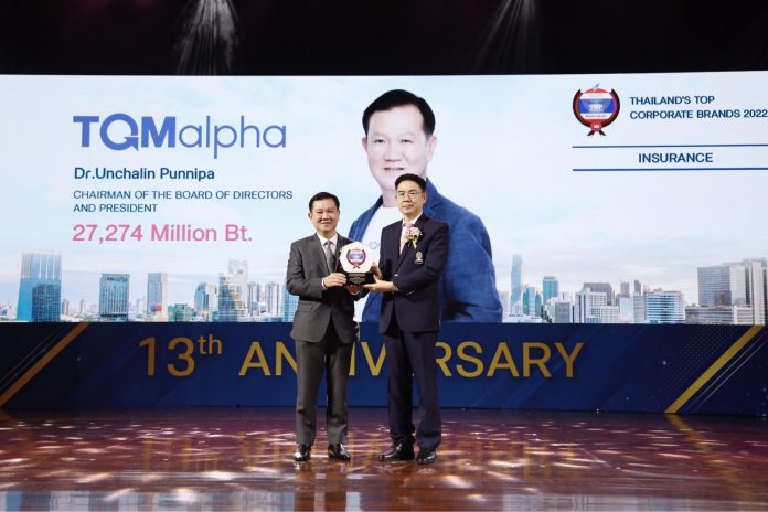 บริษัท ทีคิวเอ็ม อัลฟา จำกัด (มหาชน) หรือ TQMalpha ได้รับรางวัล ‘Thailand’s Top Corporate Brands 2022’ มูลค่าแบรนด์องค์กรสูงสุดในไทย หมวดธุรกิจประกันภัยและประกันชีวิต ด้วยมูลค่าแบรนด์ 27,274 ล้านบาท ในงาน ASEAN and Thailand ‘s Top Corporate Brands 2022 ซึ่งเป็นรางวัลที่มอบให้แก่องค์กรที่มีมูลค่าแบรนด์องค์กรสูงสุดของประเทศไทยและในอาเซียน ประจำปี 2565 จัดโดยหลักสูตรปริญญาโท สาขาการจัดการแบรนด์และการตลาด คณะพาณิชยศาสตร์และการบัญชี จุฬาลงกรณ์มหาวิทยาลัย ร่วมกับตลาดหลักทรัพย์แห่งประเทศไทย ซึ่งจัดต่อเนื่องเป็นปีที่ 13 โดยมีดร.อัญชลิน พรรณนิภา ประธานกรรมการ เข้ารับรางวัลอันทรงเกียรติในครั้งนี้ เมื่อวันที่ 19 มกราคม 256 ณ หอประชุมจุฬาลงกรณ์มหาวิทยาลัย
